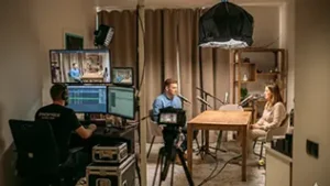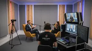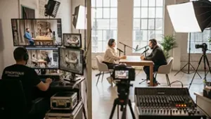 Créez vos propres contenus depuis vos locaux avec notre studio mobile (régie audiovisuelle, son, éclairage et caméras).